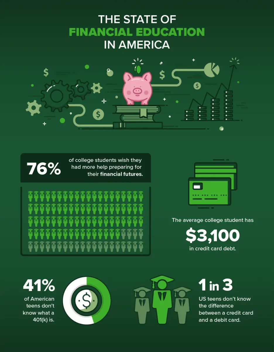 We’re not the only ones, either. According to the Financial Educators Council, 76 percent of college students wish they had more help preparing for their financial futures. Nearly half (41 percent) of US teens don’t know what a 401(k) is, and one in three don’t know the difference between a credit card and debit card.